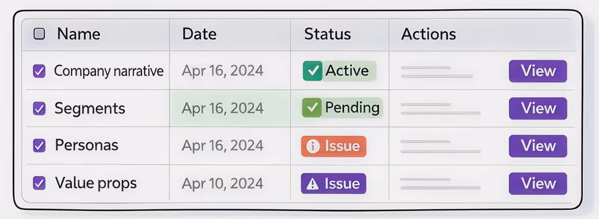A living, structured messaging brain that encodes your full positioning architecture — from products and JTBDs to personas, value props, pain points, and proof points — and makes it instantly reusable across every GTM workflow. Get started in 3 minutes with AI. Refine in 3 hours with an AI-assisted process discovery workflow.
